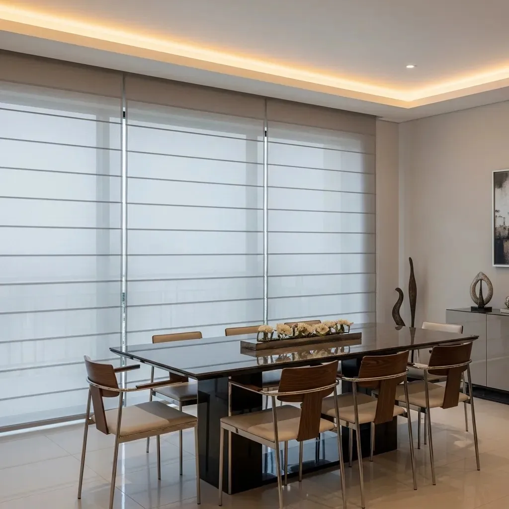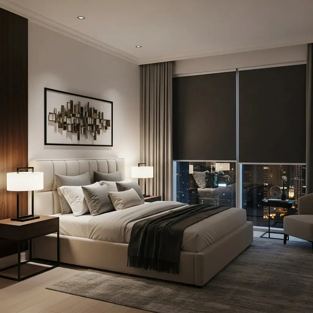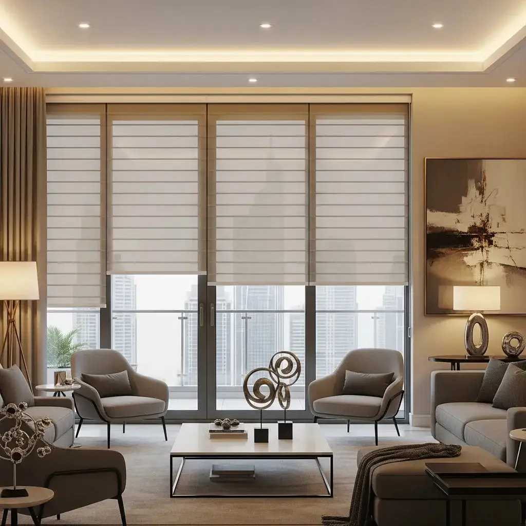 The day and night blinds, or the Duplex blinds, are popular in Dubai due to having two alternating fabric stripes, one opaque, one transparent. A person can adjust them for light filtration or privacy. These blinds not only offer dual functionality, but their versatile style makes them perfect for window décor in villas or apartments.