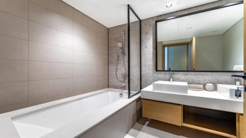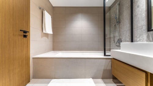 For this Dubai Hills Estate bathroom, Fixit Home redefined comfort with custom functionality. A white and caramel floating vanity counter was built with custom cabinetry below. We added black-framed glass partitions for a clean, modern division.
