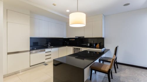 This Dubai Marina apartment needed a modern kitchen makeover, so they contacted us. We made every detail count. Fixit Home installed custom open cabinets paired with sleek, glossy black marble countertops.