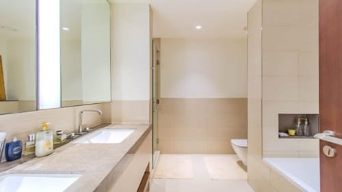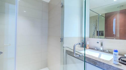 This bathroom redesign at Park Heights demanded clean luxury. We installed hinged glass shower doors with flawless alignment. A frameless mirror featuring integrated lighting and a dual vanity with matching sinks.