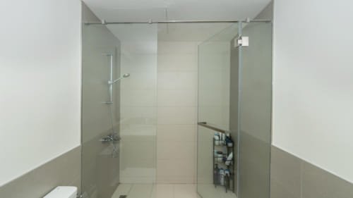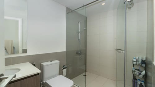 This bathroom at Park Ridge was redesigned by Fixit Home for utility. We installed sleek glass shower doors, a full-size frameless mirror, and a custom-built vanity that fits the layout perfectly.